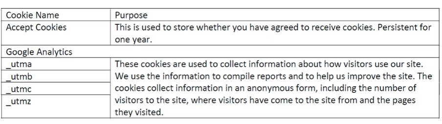 In compliance with EU legislation, the following table lists the use of cookies on this web site: